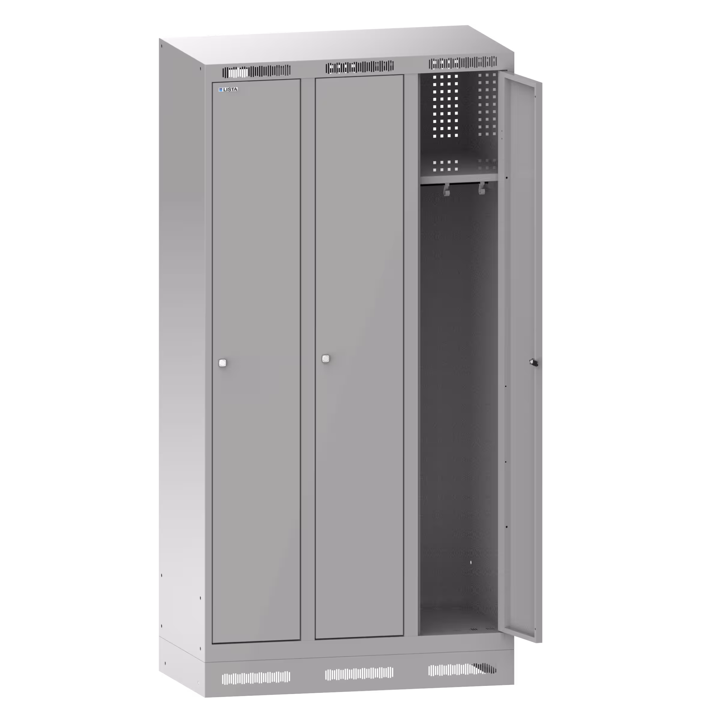 Akku-Ladeschrank mit Garderoben (BxTxH) 900x585x1800mm 3 Abteile mit Sockel, Türen glatt Typ D/Schuko 2x230V KEY Lock Weissaluminium RAL 9006