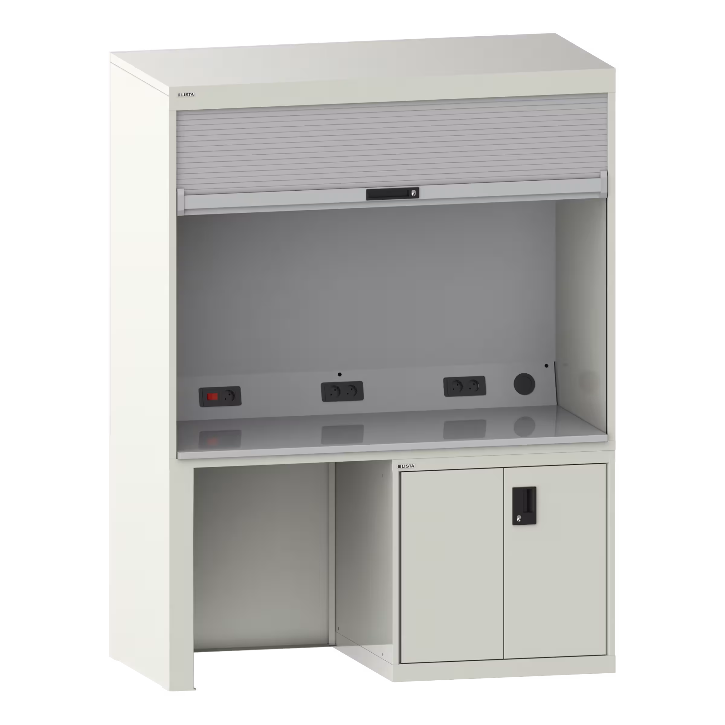 Qualityschrank: Mit Kunststoff-Rollladen inkl. Zylinderschloss, Anschlusskabel 3 m lang, Hartlaminatplatte als Arbeitsfläche, werkzeuglos eingelegt, Elektrifizierung mit 4-fach oder 5-fach Steckdose sowie Kippschalter für die im Gehäusedeckel montierte Leuchte