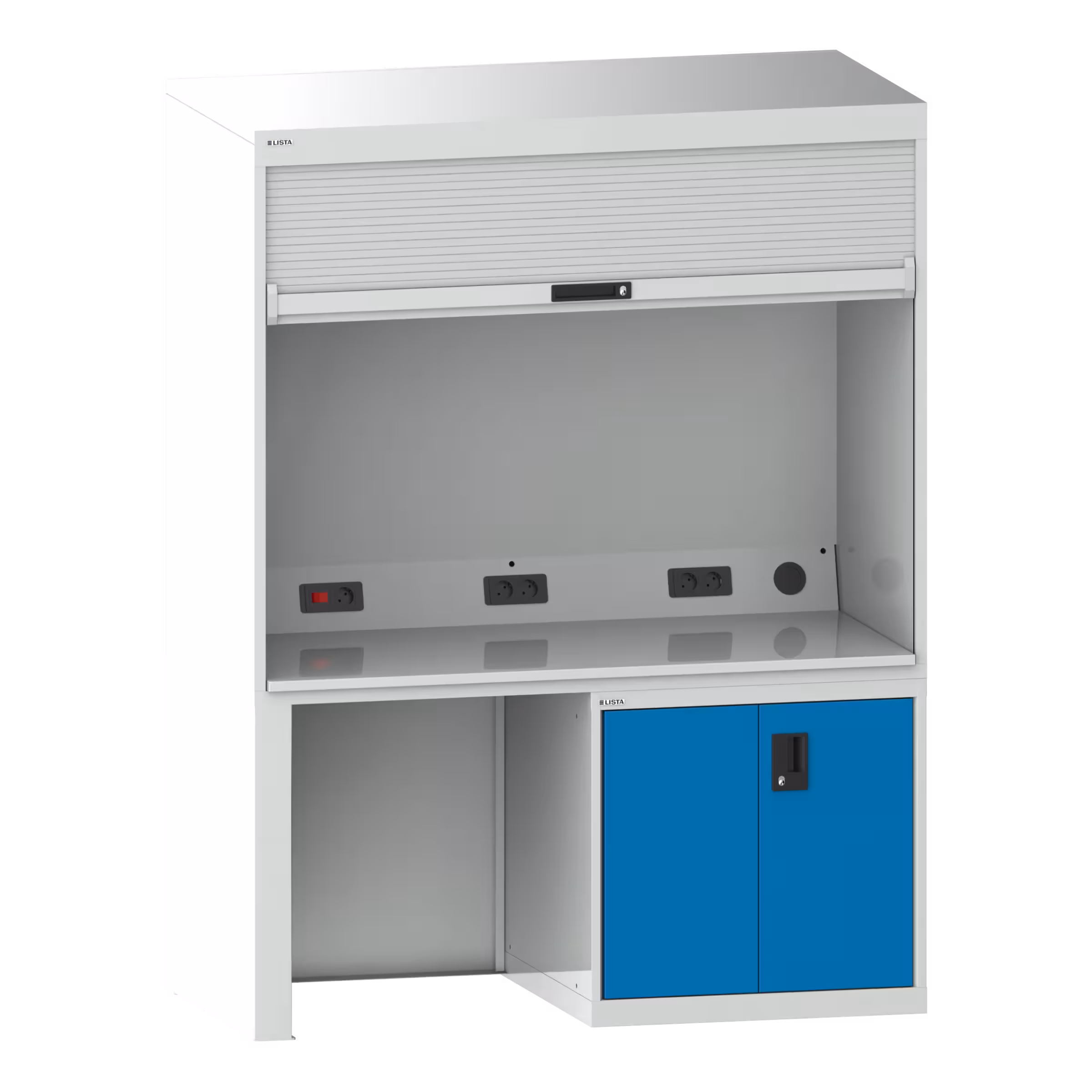 Qualityschrank: Mit Kunststoff-Rollladen inkl. Zylinderschloss, Anschlusskabel 3 m lang, Hartlaminatplatte als Arbeitsfläche, werkzeuglos eingelegt, Elektrifizierung mit 4-fach oder 5-fach Steckdose sowie Kippschalter für die im Gehäusedeckel montierte Leuchte