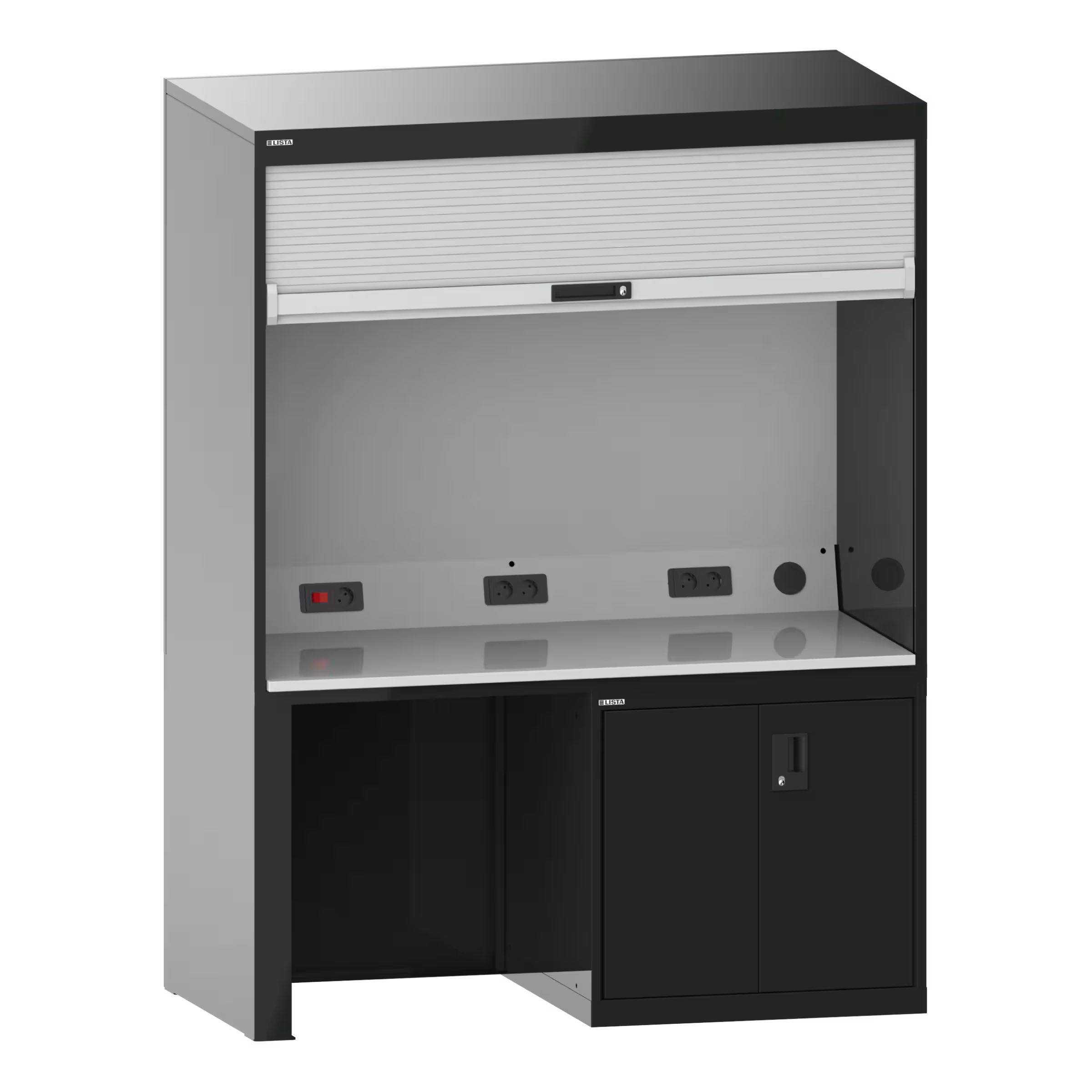 Qualityschrank: Mit Kunststoff-Rollladen inkl. Zylinderschloss, Anschlusskabel 3 m lang, Hartlaminatplatte als Arbeitsfläche, werkzeuglos eingelegt, Elektrifizierung mit 4-fach oder 5-fach Steckdose sowie Kippschalter für die im Gehäusedeckel montierte Leuchte