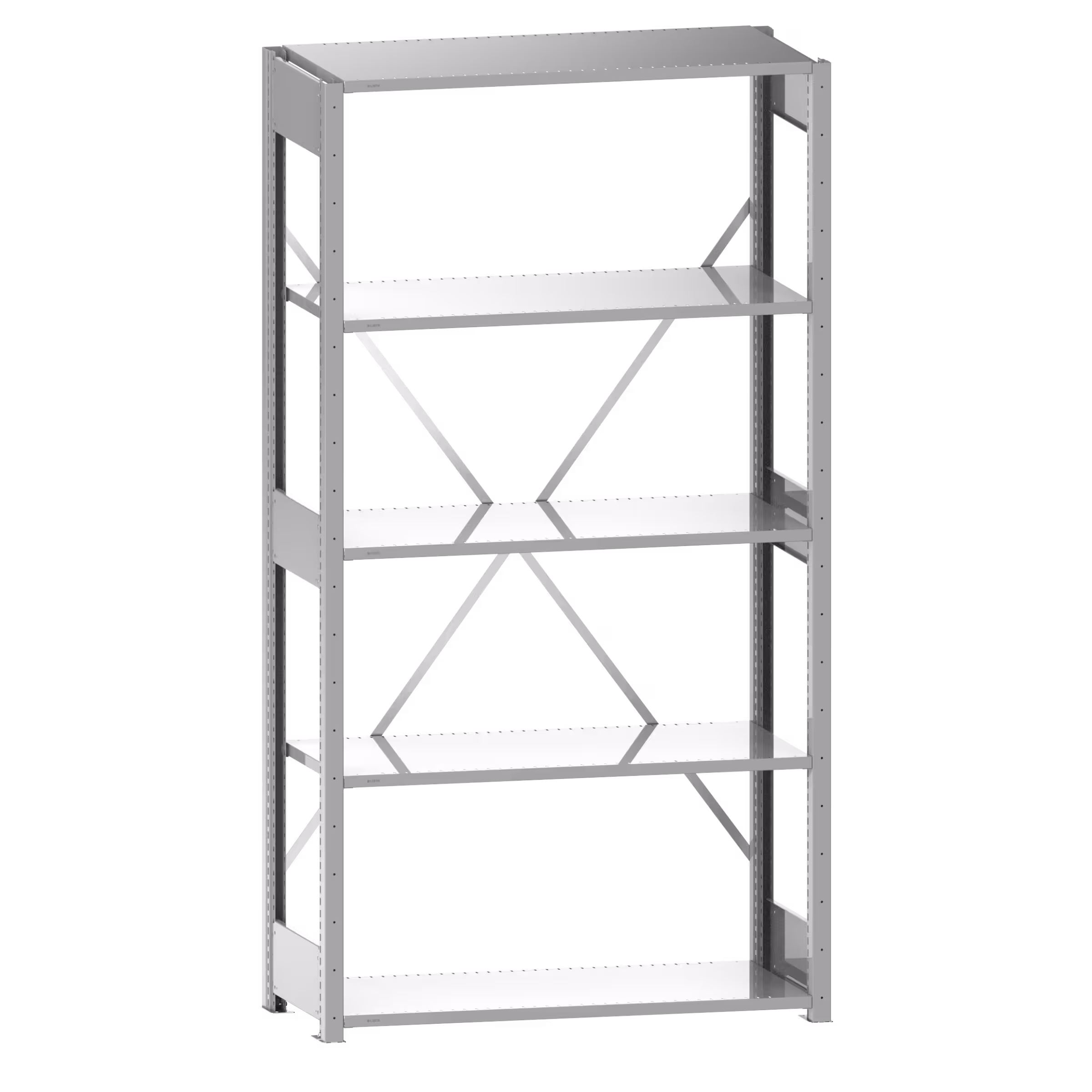 2 Regalstützenpaare inkl. 6 Tiefenstreben, 1 Diagonalkreuz verzinkt, Fachböden geschlitzt (Stärke 25 mm)