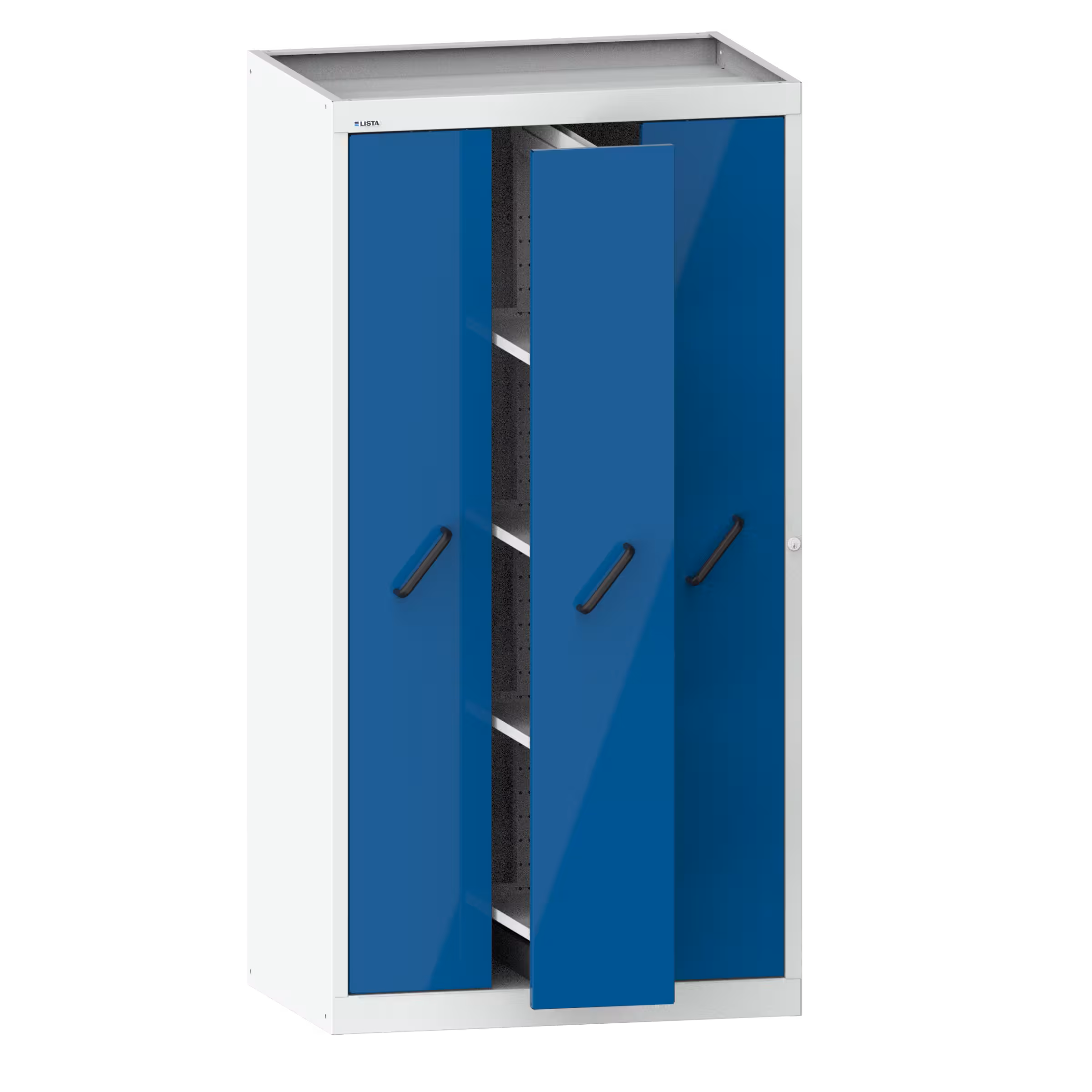 Vertikalauszugschrank mit Frontblenden (BxTxH) 1000x695x1950mm 3 Auszüge mit 4 Verstellböden pro Auszug Lichtgrau RAL 7035 / Capriblau RAL 5019