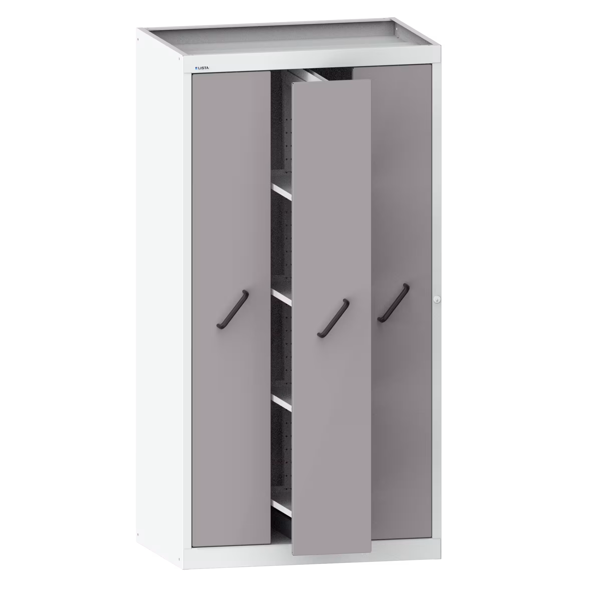 FARBEN: Bei vorkonfigurierten Schränken Gehäuse, Auszüge innen, Verstellböden und Lochwände in Lichtgrau, RAL 7035.