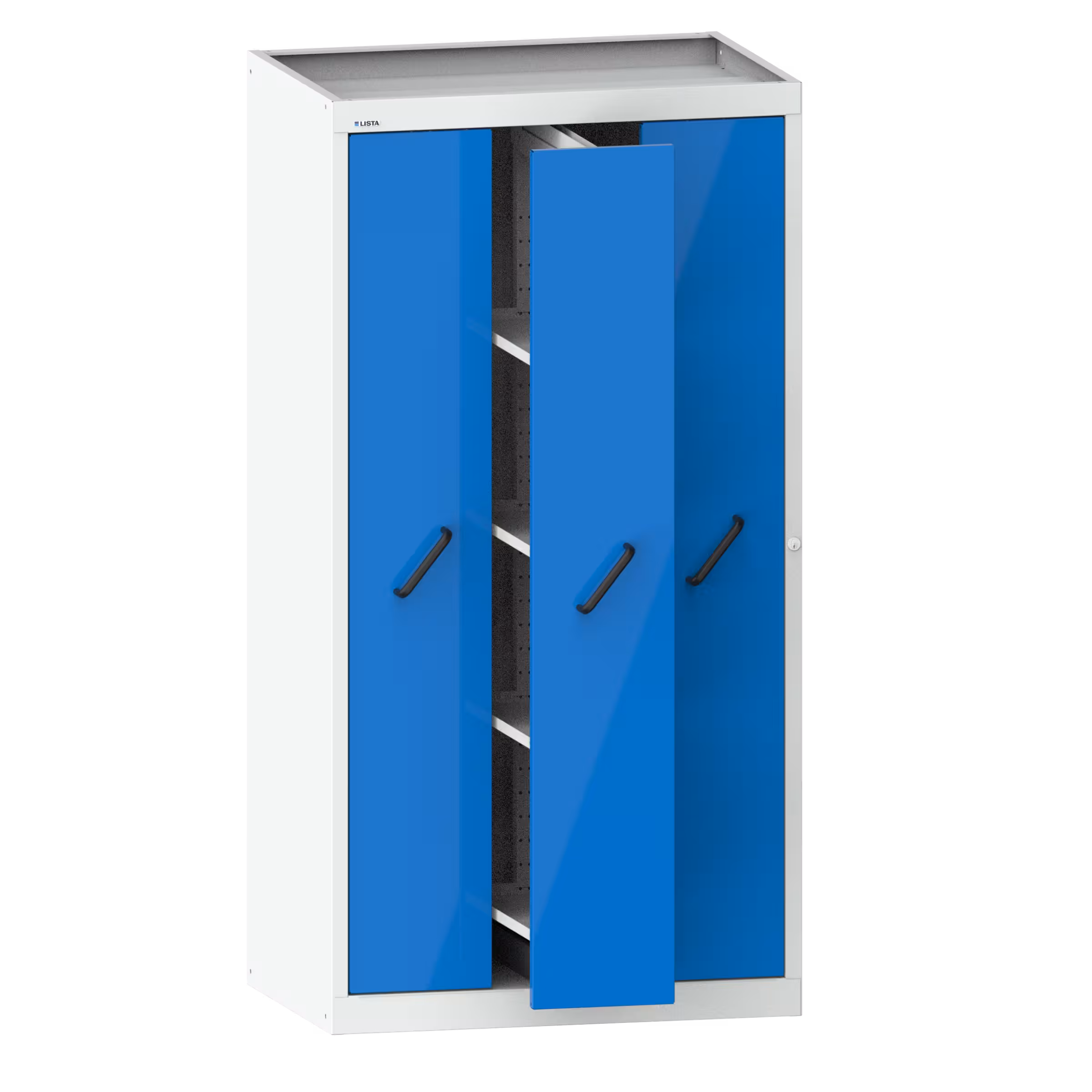Vertikalauszugschrank mit Frontblenden (BxTxH) 1000x695x1950mm 3 Auszüge mit 4 Verstellböden pro Auszug Lichtgrau RAL 7035 / Himmelblau RAL 5015