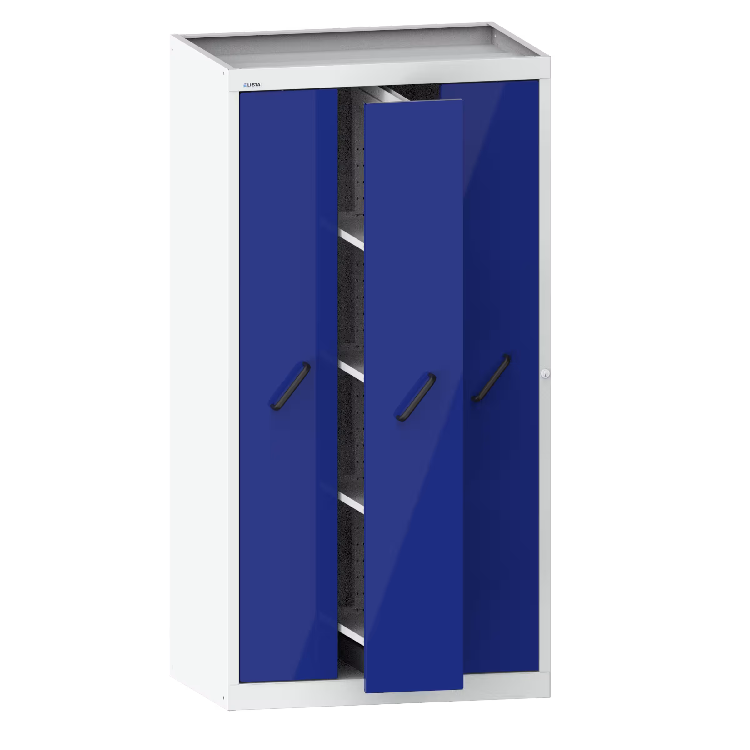 Vertikalauszugschrank mit Frontblenden (BxTxH) 1000x695x1950mm 3 Auszüge mit 4 Verstellböden pro Auszug Lichtgrau RAL 7035 / Ultramarinblau RAL 5002