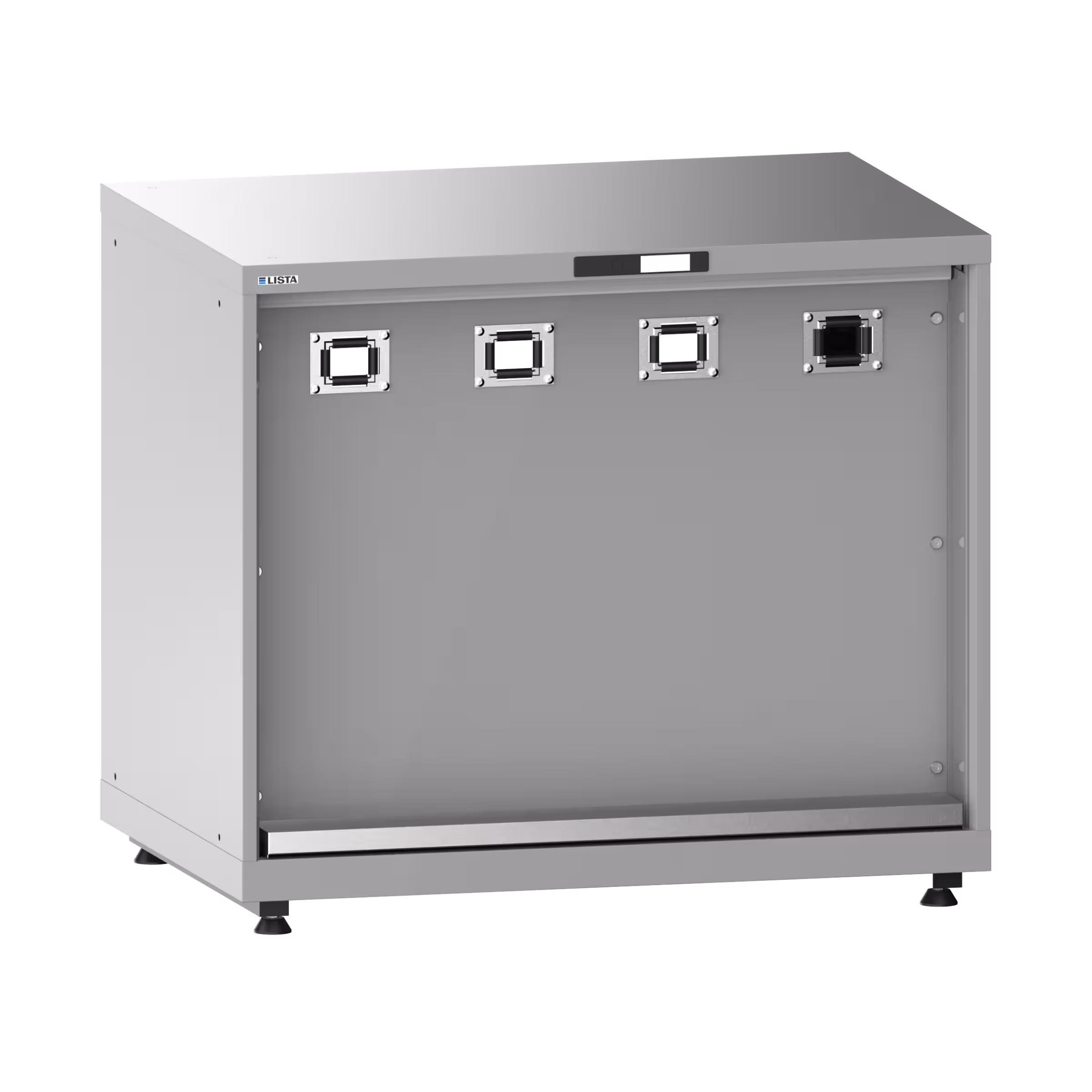 Armoire d’alimentation 54x36E (LxPxH) 1023x725x895-940mm 4 x accès pour flexibles/1 x bac de rétention avec kit de pieds de mise à niveau pour caches (4 x pieds, 45-90mm) et set de montage Aluminium blanc RAL 9006