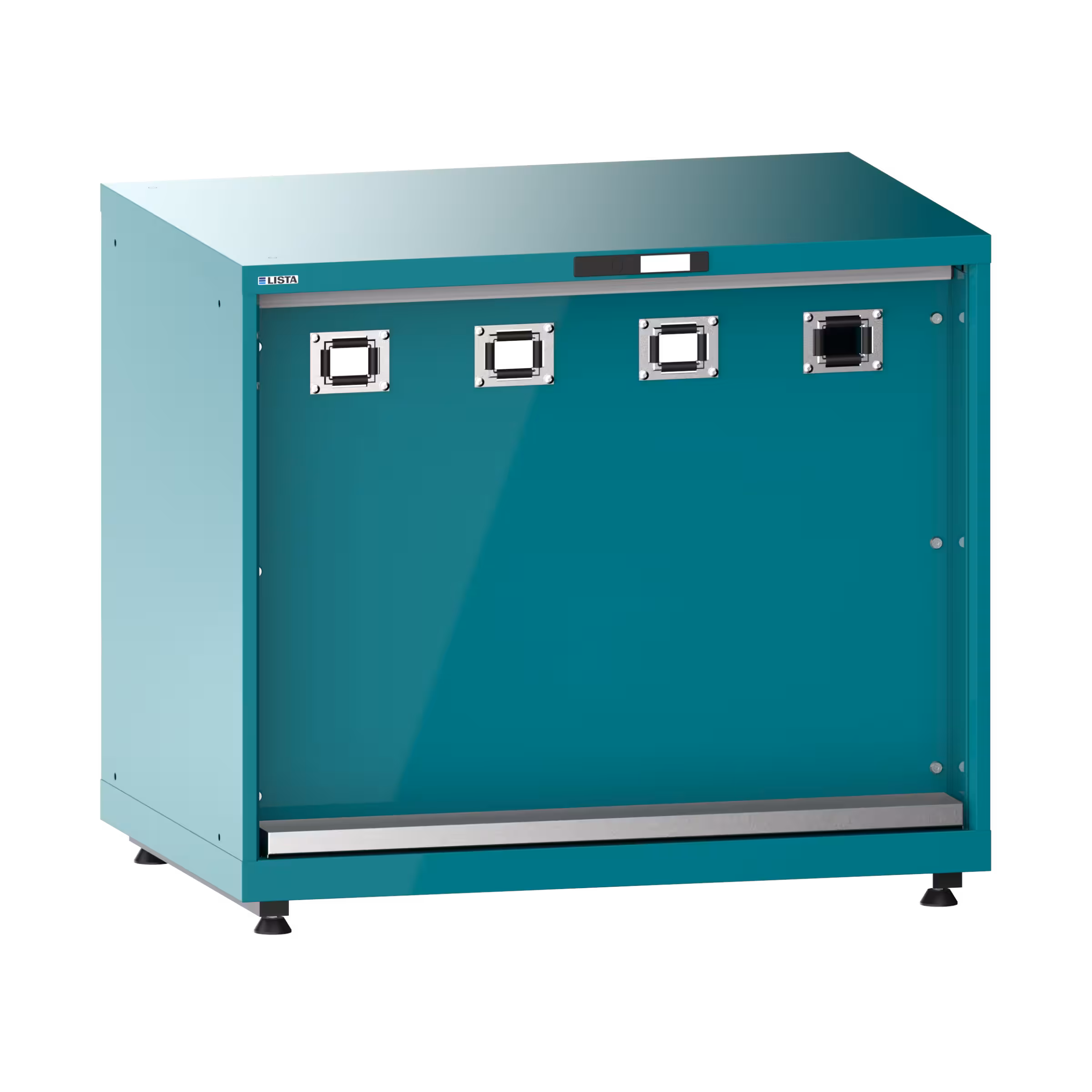 Armoire d’alimentation 54x36E (LxPxH) 1023x725x895-940mm 4 x accès pour flexibles/1 x bac de rétention avec kit de pieds de mise à niveau pour caches (4 x pieds, 45-90mm) et set de montage Bleu turquoise RAL 5018
