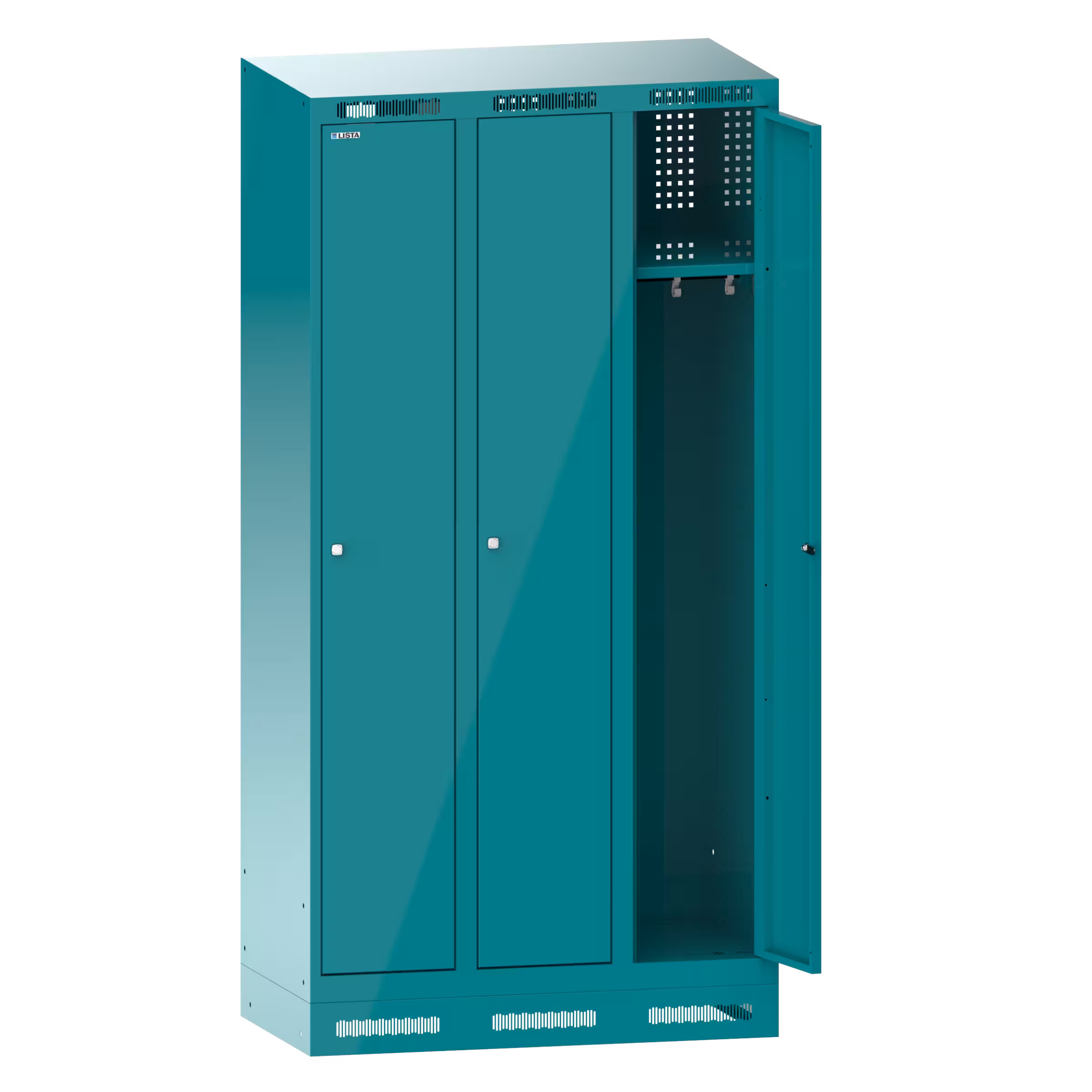 Armoires-vestiaires : Chaque compartiment des armoires-vestiaires électriques est équipé des éléments suivants : une porte à un battant en tôle pleine encastrée, surface lisse (un compartiment fermé), un rayon à chapeau, un tringle porte-habits avec trois patères mobiles, un porte-serviette, deux prises 230 V.