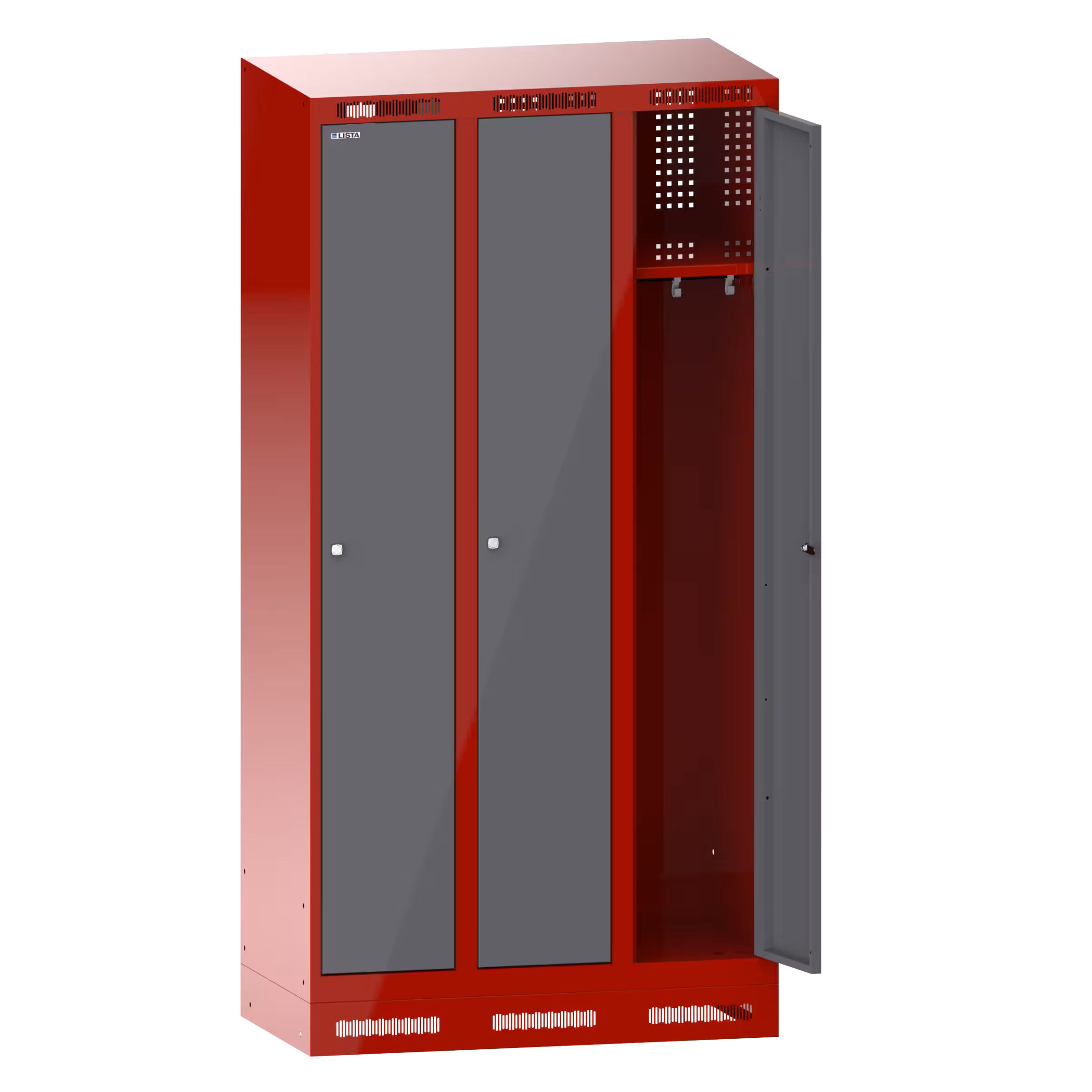 Armoire-vestiaire de charge de batterie (LxPxH) 900x585x1800mm 3 compartiments avec socle, porte lisse Type D/Schuko 2x230V KEY Lock Rouge rubis RAL 3003 / Gris métallique NCS S 6502-B