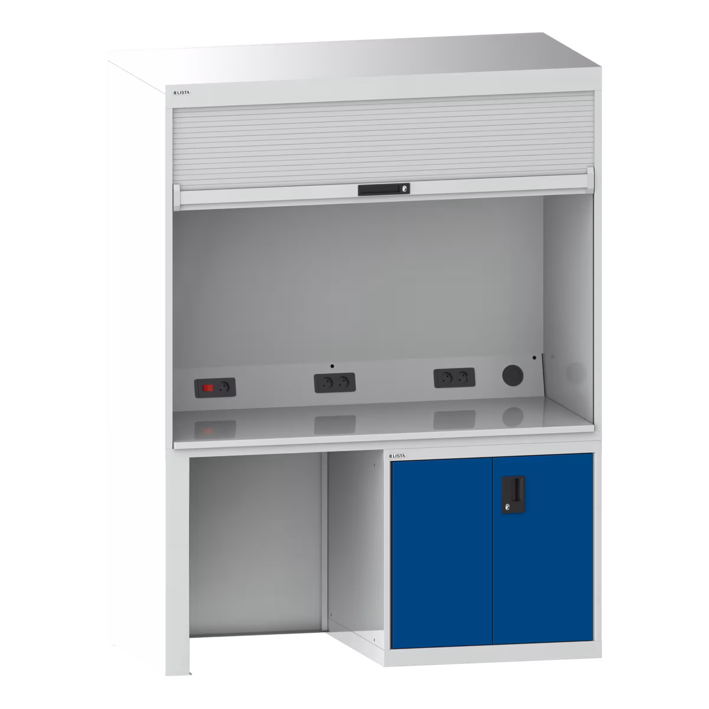 Armoire Qualité : Avec rideau en plastique et cylindre de fermeture, câble de raccordement de 3 m de long, plateau en laminé dur comme surface de travail, installé sans outils, électrification avec 4 ou 5 prises (230V) et commutateur à bascule pour la lampe montée dans le couvercle du bâti.